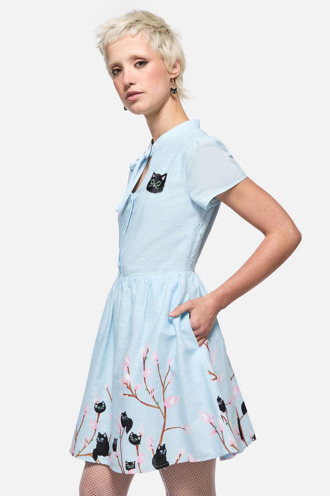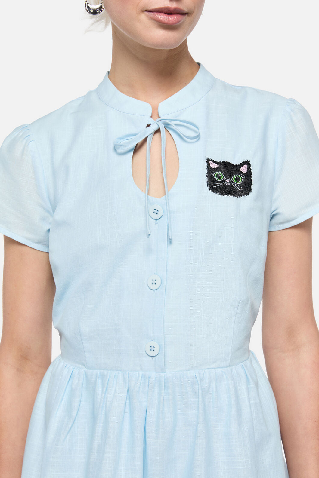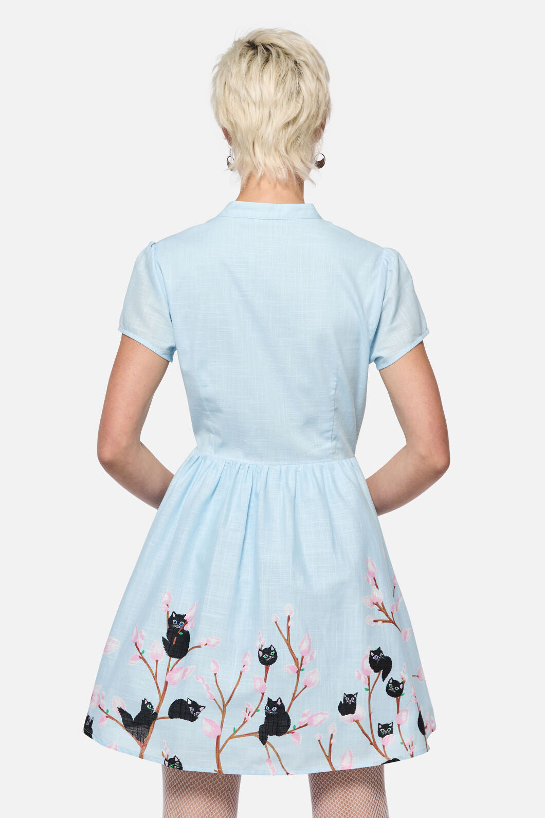 So sweet it hurts—the Pussy Willow Border Dress by Dangerfield is a darling nod to vintage style with a cheeky twist. Featuring custom ‘Pussy Willow’ artwork (yes, those are kittens as flowers!), this revival-inspired mini is perfect for 1940s fashion lovers and modern-day dolls alike. Finished with a keyhole cut-out collar and button-down front, it’s a true collectible for print lovers and retro romantics.